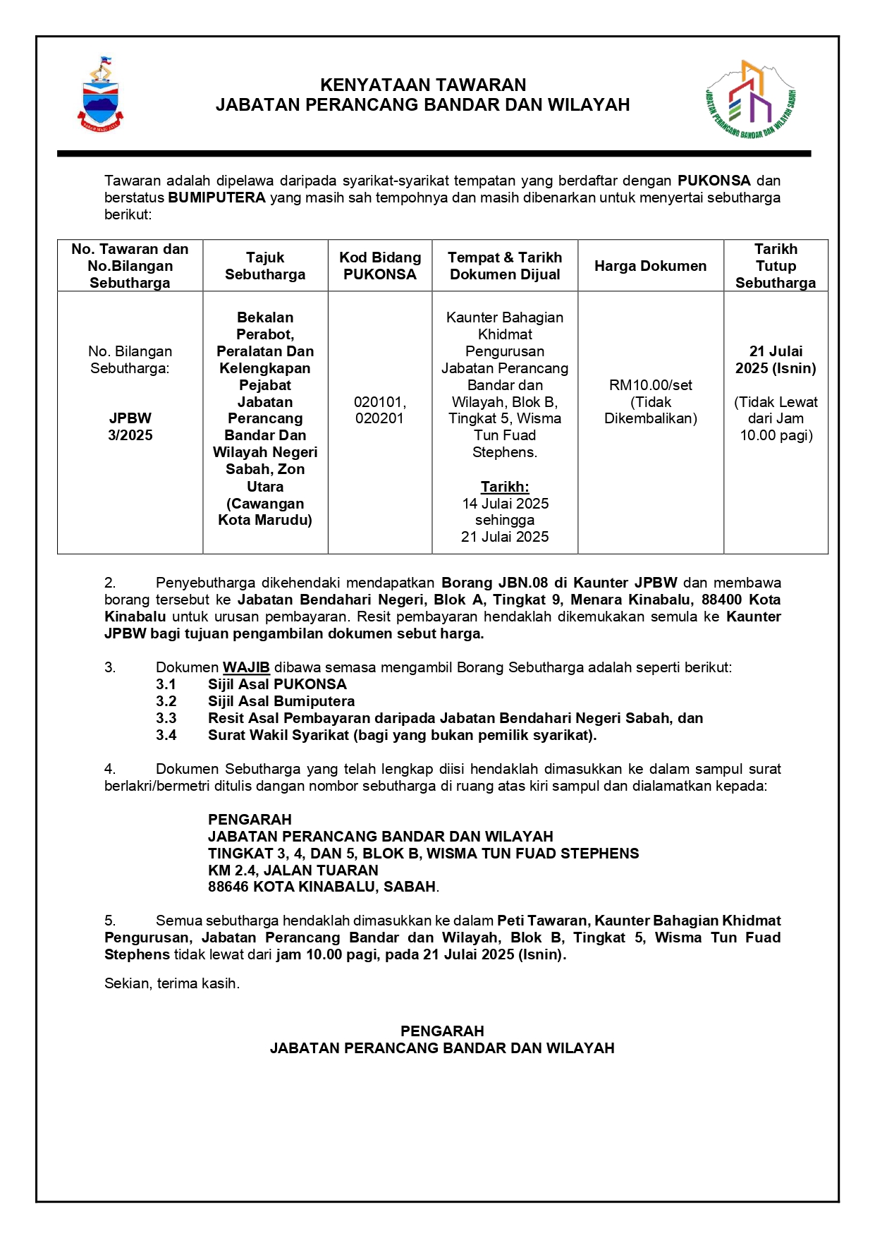 KENYATAAN TAWARAN | MEMBEKALKAN PERABOT, PERALATAN & KELENGKAPAN PEJABAT